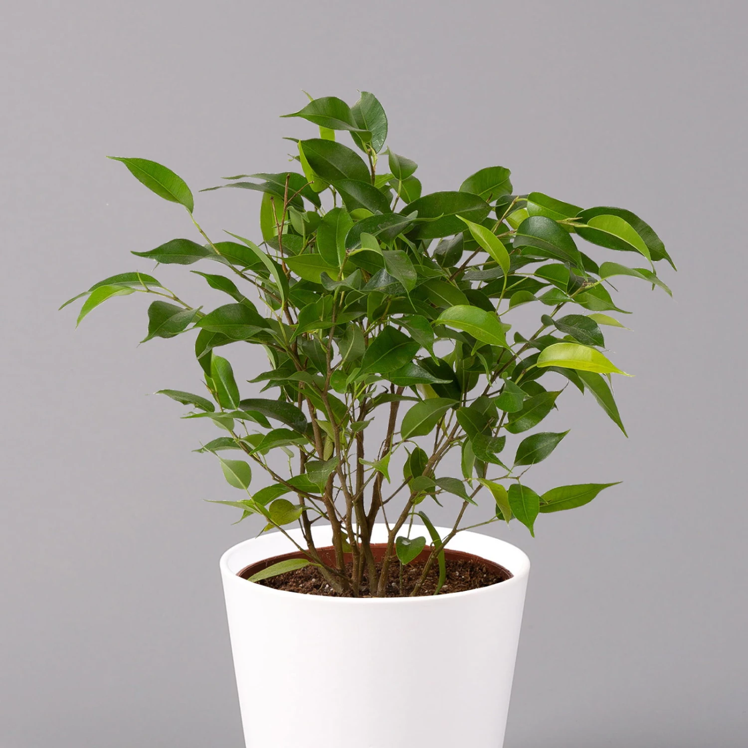 Der Ficus benjamina ‚Natasja’‘ mit seinen dunkelgrünen, glänzenden Blättern ist ein Highlight für jeden Raum. Bekannt ist diese Zimmerpflanze auch unter dem Namen Birkenfeige und besticht mit ihrem buschigen Wuchs und den spitz zulaufenden Blättern. Ihre Birkenfeige macht sowohl im Wohnzimmer als auch im Office eine gute Figur und fühlt sich in hellen sowie halbschattigen Lagen gleichermaßen wohl. Auch für Ihr Schlafzimmer ist der Ficus benjamina ‚Natasja‘ die richtige Wahl, da er Schadstoffe, wie z.B. Kohlenmonoxid abbauen kann. Gießen Sie den Ficus eher sparsam, das Substrat können Sie gerne antrocknen lassen. Im Sommer dürfen Sie Ihre Birkenfeige auch im Freien an einem windgeschützten Standort ohne direkte Sonneneinstrahlung stellen. Achten Sie darauf, dass es der Pflanze nicht zu kalt wird, denn auch im Winter dürfen die Lufttemperaturen im Raum nicht unter 15 Grad Celsius fallen. Bitte stellen Sie Ihre Birkenfeige außerhalb der Reichweite von Kindern oder Hautieren auf, da ihr Milchsaft giftig ist.
