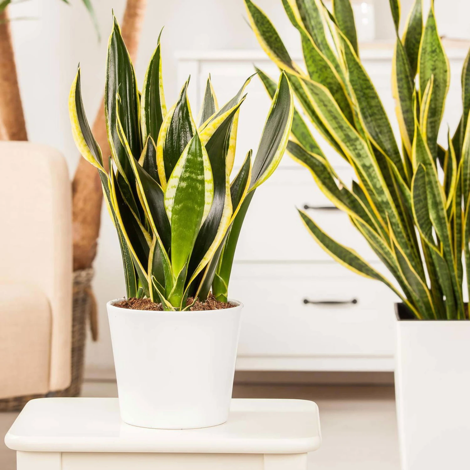 Die Sansevieria trifasciata ‚Futura Superba‘, der Bogenhanf, begeistert mit den panaschierten, großzügig dimensionierten Blättern und gehört zu den unverwüstlichen Pflanzen für Innenraumbegrünung. Die Sansevieria hat kein Problem mit spärlichen Wassergaben, verträgt dagegen keine Staunässe. Sie dürfen gerne Ihre Sansevieria am Südfenster pflegen, denn das aus Afrika stammende Gewächs profitiert von direkter Sonne. Jedoch hat die Sansevieria keine Probleme mit Halbschatten und entwickelt sich an solchen Standorten ebenfalls harmonisch. Der Bogenhanf sieht nicht nur ansprechend aus, sondern funktioniert auch als ein leistungsstarker, natürlicher Raumluftfilter. Der Bogenhanf bindet Benzole, Toluole und sonstige Schadstoffe, die unter anderem von der modernen Bürotechnik sowie beim Rauchen und Kochen emittiert werden.