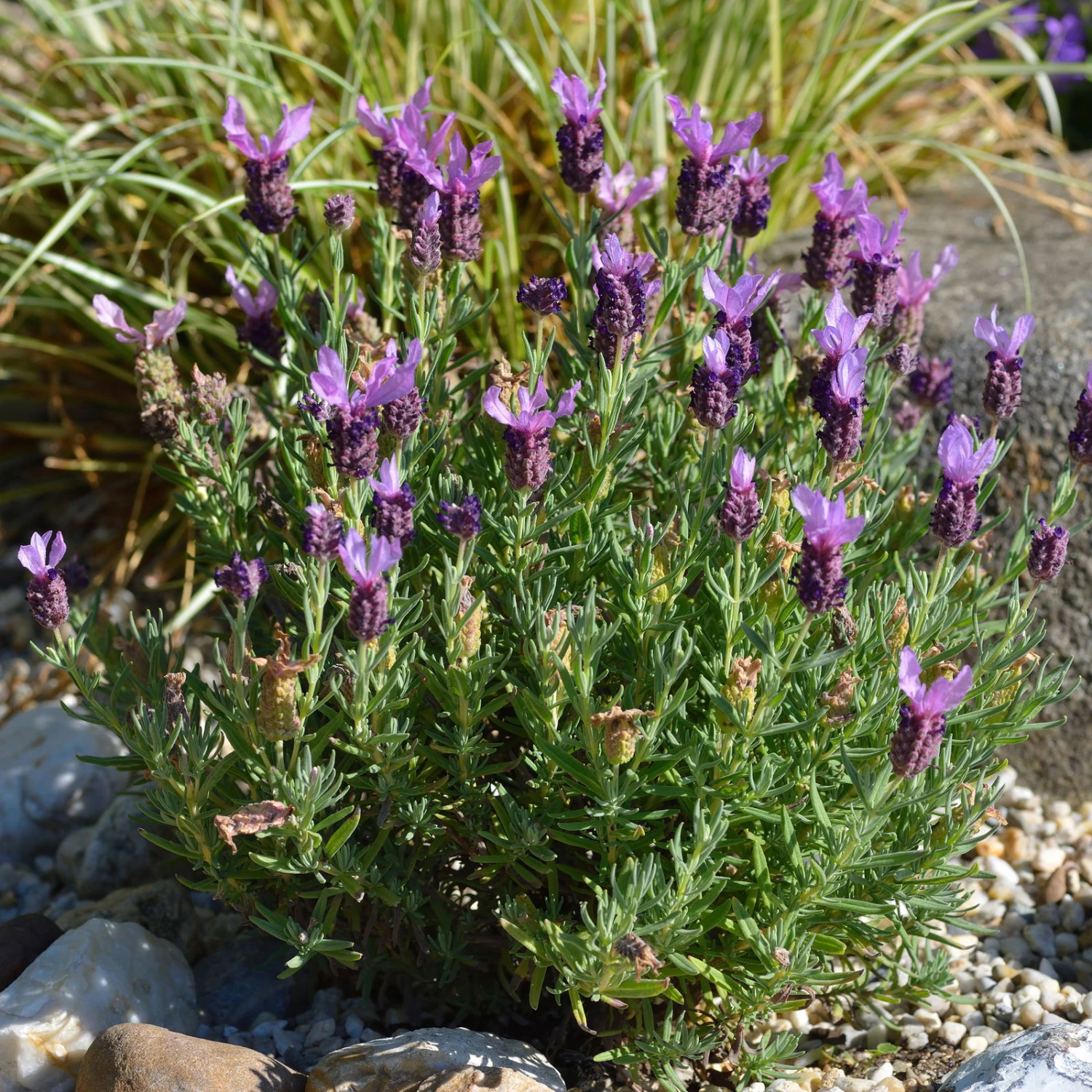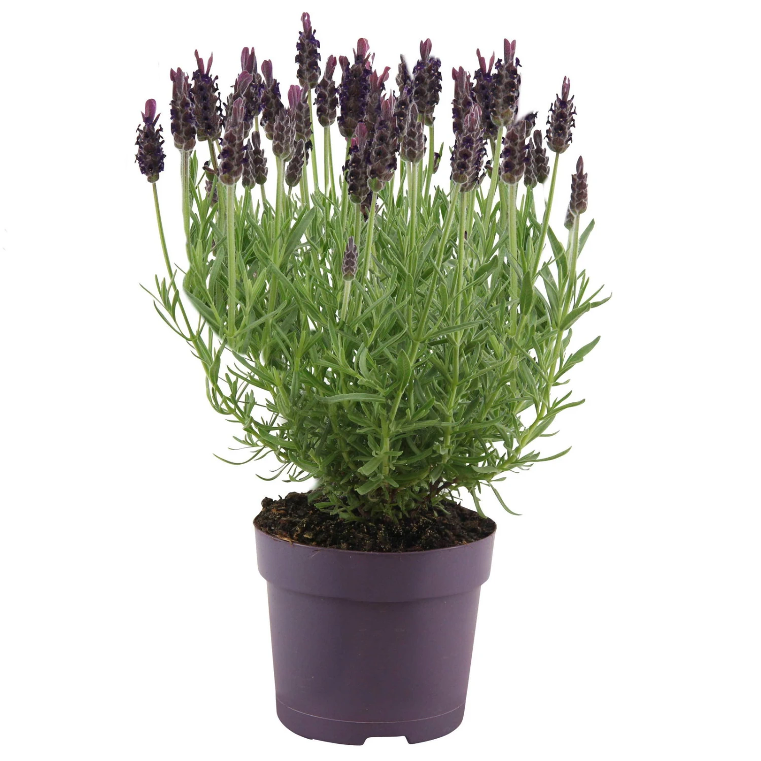 Lavandula stoechas ‚Anouk‘, der Schopflavendel, ist ein aromatischer Sommerblüher. Der Lavendel stammt aus dem Mittelmeerraum und ist eine schöne Gartenpflanze. Mit diesem hübschen Halbstrauch können Sie zum Beispiel Ihre Blumenbeete effektvoll einfassen und auffallende Akzente in Lila setzen. Außerdem ist Lavandula stoechas ‚Anouk‘ ein klassischer Rosenbegleiter, denn durch seinen intensiven Duft soll der Lavendel diverse Schädlinge vertreiben und sorgt somit für die optimale Gesundheit Ihrer Rosen. Dafür aber lockt Ihr Schopflavendel zahlreiche nützliche Insekten wie Bienen oder Schmetterlinge in Ihren Garten und dient auf diese Weise der Natur. Lavandula gedeiht an einem hellen, sonnigen Standort und stellt ansonsten keine besonderen Ansprüche an die Pflege. Schopf-Lavendel ist nur bedingt winterhart und benötigt einen Winterschutz. In Kübeln gepflanzt, sollte er an einem frostfreien, hellen Platz überwintert werden.